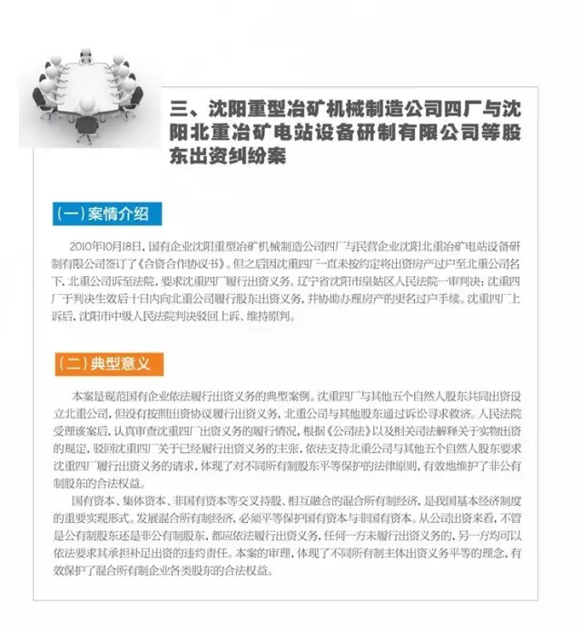 本案是规范国有企业依法履行出资义务的典型案例。沈重四厂与其他五个自然人股东共同出资设立北重公司,但没有按照出资协议履行出资义务,北重公司与其他股东通过诉讼寻求救济。人民法院受理该案后,认真审查沈重四厂出资义务的履行情况,根据《公司法》以及相关司法解释关于实物出资的规定,驳回沈重四厂关于已经履行出资义务的主张,依法支持北重公司与其他五个自然人股东要求沈重四厂履行出资义务的请求,体现了对不同所有制股东平等保护的法律原则,有效地维护了非公有制股东的合法权益。
