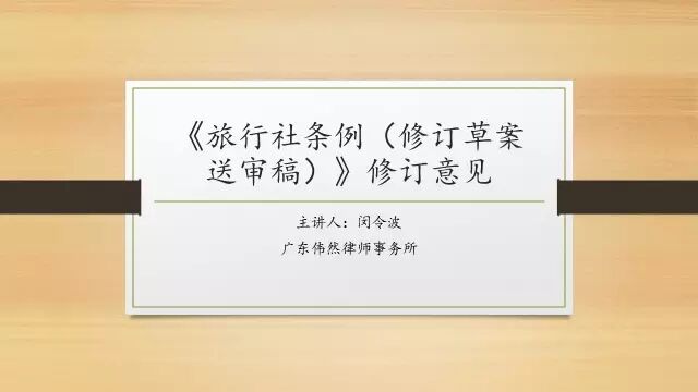 近期,为响应《旅行社条例(修订草案送审稿)》向社会公众公开征求意见的号召,2016年8月24日深圳市旅游协会在行业内部组织召开了对《旅行社条例(订草案送审稿)》修订意见提出建议的会议。会议特邀广东伟然律师事务所主任闵令波律师对送审稿意见作出相关说明和解释。