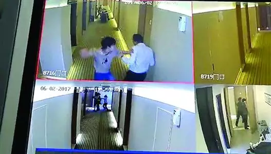 酒店监控显示散发“小卡片”者殴打前来阻拦的酒店员工 本版图片/酒店方供图