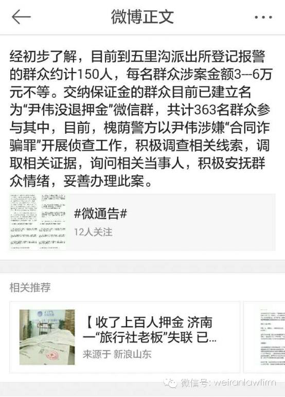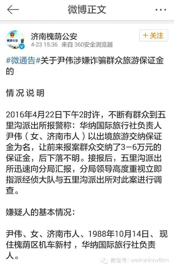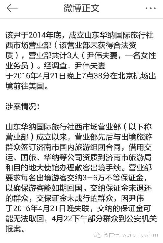 2016年4月23日下午3时许,济南槐荫公安局在其官方微博上发表了一则“关于尹伟涉嫌诈骗群众旅游保证金”微通告,该公告称,2016年4月22日下午2时许,不断有群众到五里沟派出所报警称:华纳国际旅行社负责人尹伟(女、济南市人)以出境旅游交纳保证金为名,让前来报案群众交纳了3—6万元的保证金,后下落不明,经调查,尹伟夫妇已于2016年4月21日晚上7点38分在北京机场出境前往美国。接报后,五里沟派出所迅速向分局汇报,分局领导高度重视立即指派经侦大队与五里沟派出所对此案进行调查。