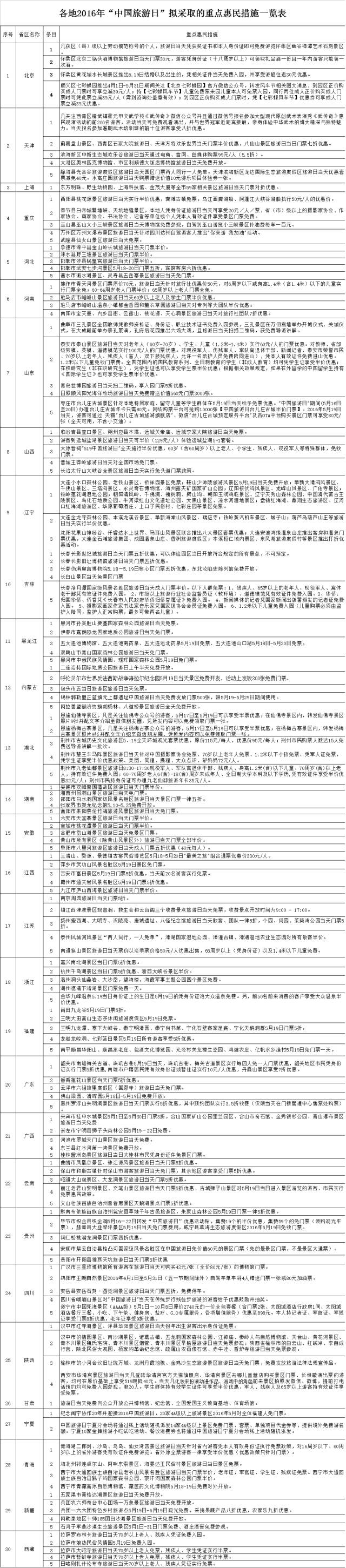 各地2016年“中国旅游日”拟采取的重点惠民措施