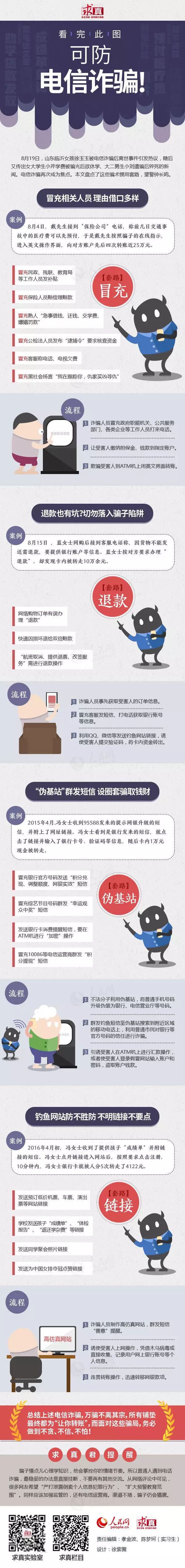 8月19日,山东临沂18岁的准大学生徐玉玉学费被骗光后不幸离世。随后,又传出临沂女大学生小芹8月19日也遭遇了电信诈骗,骗子冒充警方称小芹涉嫌非法洗钱并要求彻查资金,情急之下小芹把6800元学费全部转出,事后才意识到自己受骗。23日,临沂大二男生遭电信诈骗后在家中猝死。连日来,几起大学生被骗事件使人们再次聚焦电信诈骗。诈骗人员不断翻新犯罪手法,利用社会热点,精心设计骗术,对受害人进行欺骗、引诱、威胁,针对不同群体量身定做、步步设套,令人防不胜防。本文盘点了电信诈骗的案例和手段,希望在大家在遭遇诈骗时,只要对方提到各种文中元素,心中就鸣起警钟。