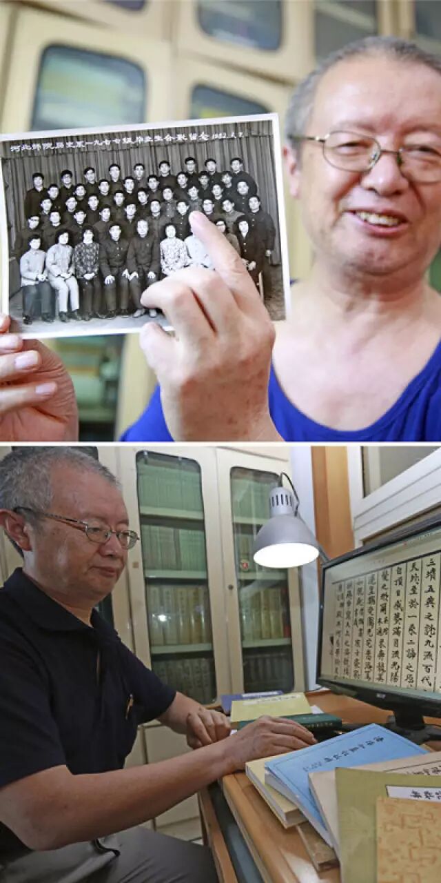 这张拼版照片显示的是:6月1日,秦进才在77级毕业留念照中找到自己(上图);6月1日,秦进才在家中研究历史文献(下图)。1953年出生的秦进才是河北师范大学历史文化学院的教授、博士生导师。1977年恢复高考后,家境贫寒的他报名参加,最终顺利考上当时的河北师范学院。新华社发(詹新城 摄)