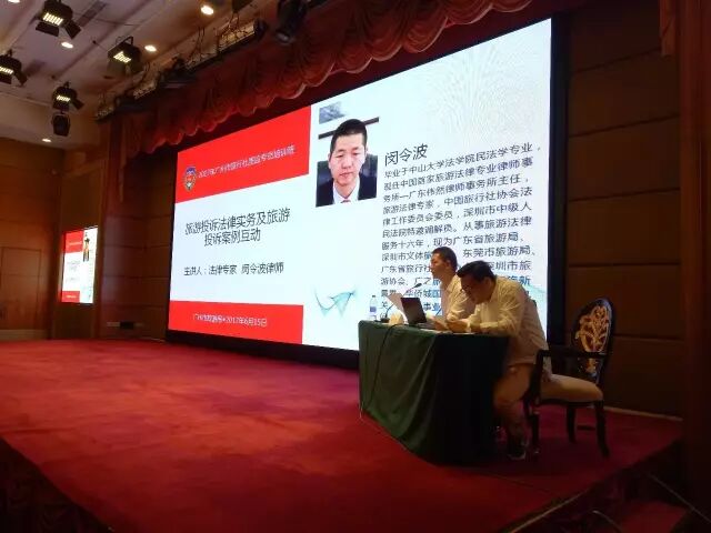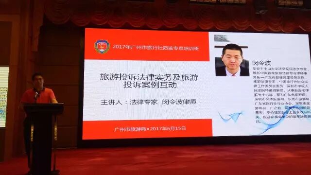 2017年6月15日,广州市旅游局质量监督管理所主办的“2017年广州市旅行社质监专员培训班”在广州流花宾馆隆重开班。市旅游局徐颖副巡视员做了开班动员讲话,并就广州2015以来三年的旅游投诉进行了重要分析。李怀恩副所长(主持工作)、吴平国副所长全程参加了会议。广州市、区旅游局领导、相关人员以及全市各旅行社质监专员共300多人参加了培训。闵令波律师作为广东省旅游局常年法律顾问参加会议并为全体质监专员做培训。
