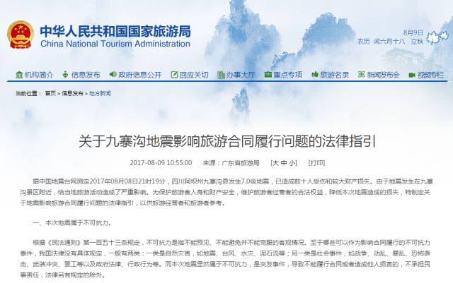 据中国地震台网测定2017年08月08日21时19分,四川阿坝州九寨沟县发生7.0级地震,已造成数十人受伤和较大财产损失。由于地震发生在九寨沟景区附近,给当地旅游活动造成了严重影响。为保护旅游者人身和财产安全,维护旅游者经营者的合法权益,降低本次地震造成的损失,特制定关于地震影响旅游合同履行问题的法律指引,以供旅游经营者和旅游者参考。