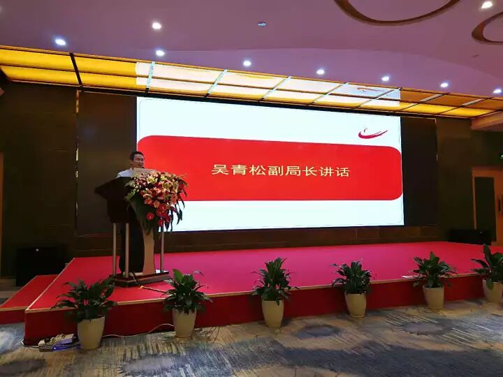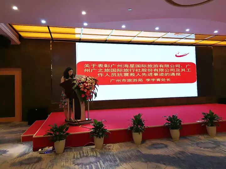 李宇青处长宣读广州市旅游局《关于表彰广州海星国际旅游有限公司、广州广之旅国际旅行社股份有限公司及其工作人员抗震救人先进事迹的通报》。