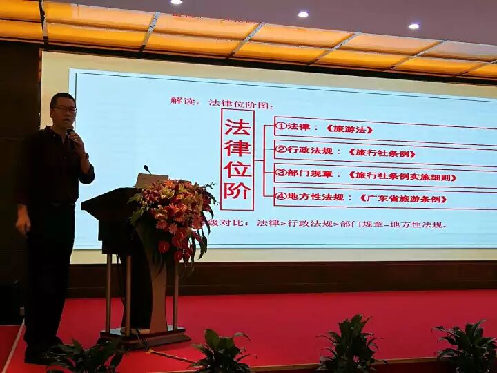 会议上,闵令波律师向参会人员讲解了《广东省旅游条例》与其他法律法规的效力位阶,重点讲解了该条例中有关旅游者、旅游经营者、旅游从业人员的权利义务、禁止性规定、法律责任以及纠纷救济途径,并针对条例中有关民宿登记制,微信、博客等社交平台或行业协会、车友会、驴友会未取得旅行社资质不得从事旅游经营业务,开展网络经营的旅行社、网络交易第三方平台和旅游搜索引擎的责任,禁止以烧香、解签等为名诱骗、胁迫旅游者消费等亮点规定进行了讲解。